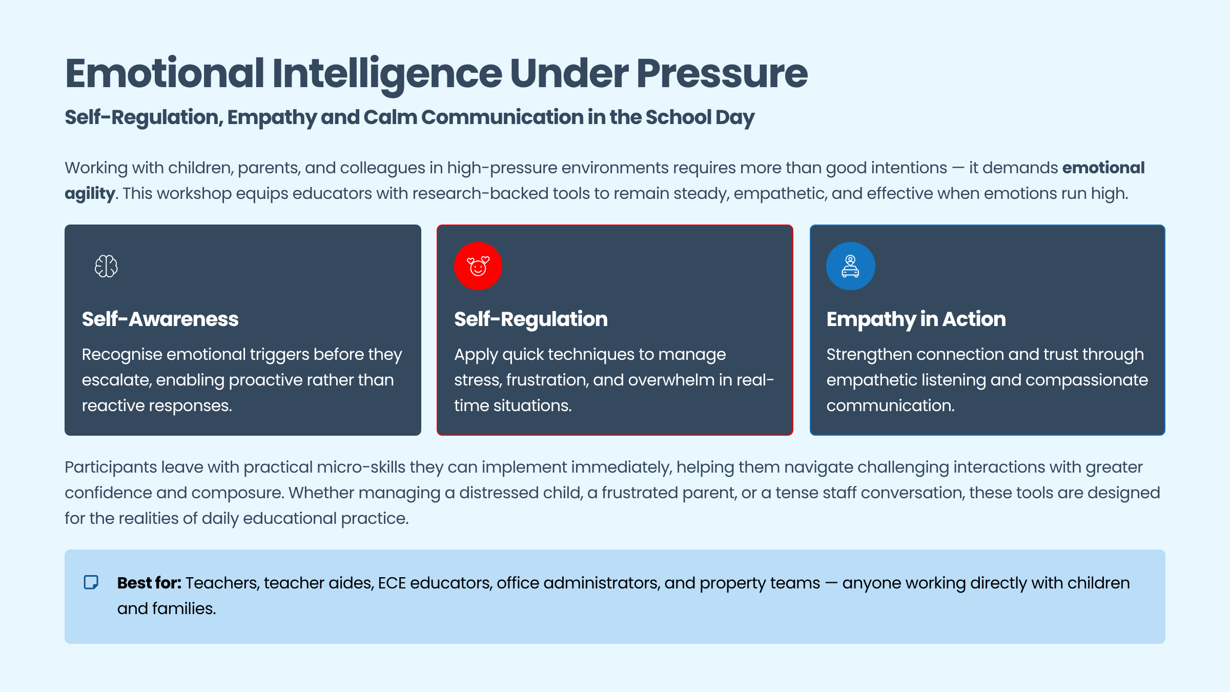 Working with children, parents, and colleagues in high-pressure environments requires more than good intentions. It demands emotional agility. This workshop equips educators with research-backed tools to remain steady, empathetic, and effective when emotions run high.